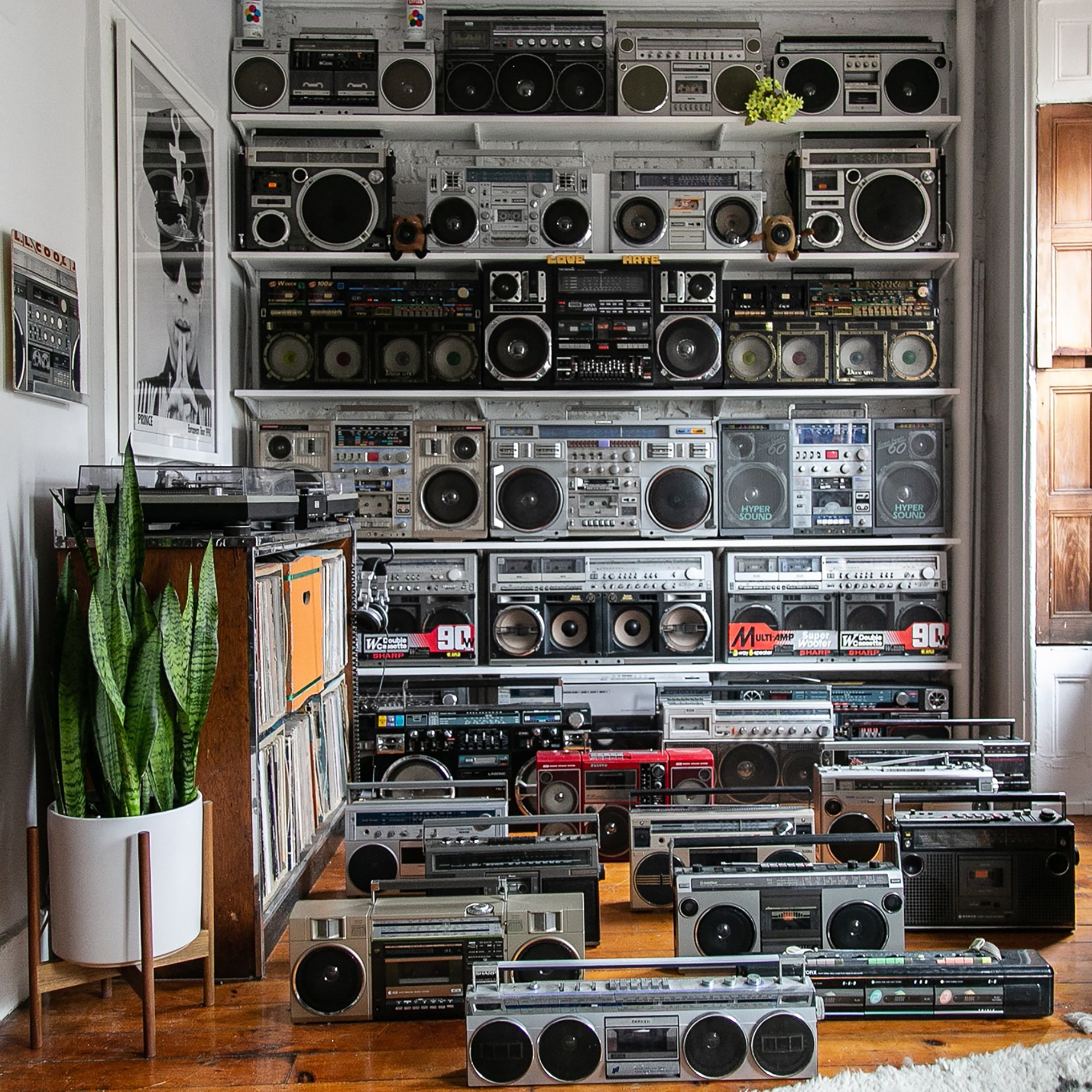 Entrar en el espacio de Scott Campbell es como recibir un puñetazo de nostalgia plateada. En las paredes, los vúmetros de agujas oscilan y los LEDs rojos parpadean al ritmo de un bajo que se siente en el esternón. Aquí, el rey es el Boombox.